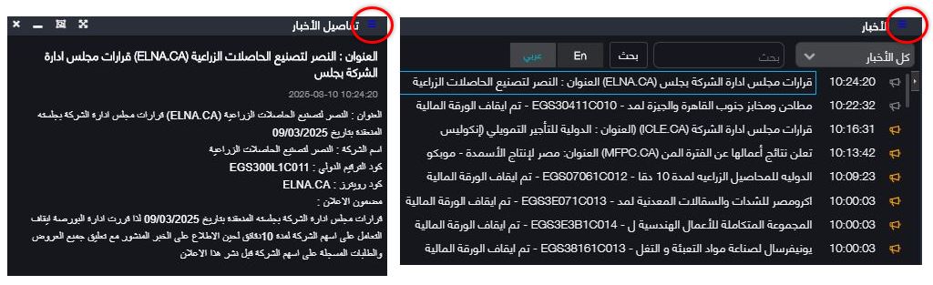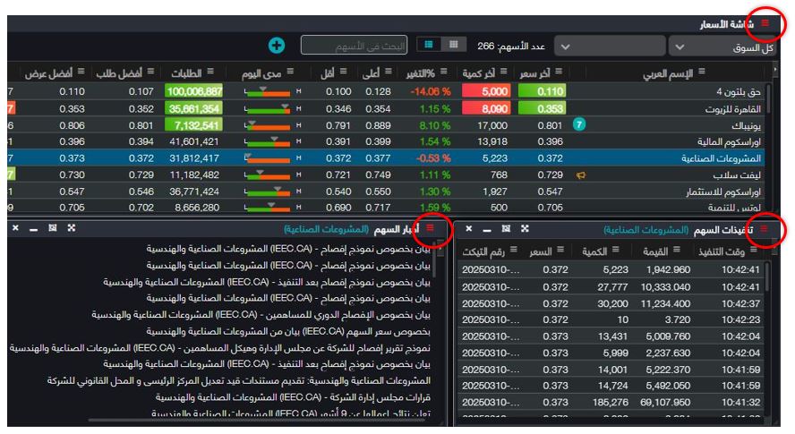 إضغط مرة واحدة بشمال الماوس على سهم فى شاشة الأسعار ليتم عرض بياناته فى نافذة أخبار السهم ونافذة التنفيذات بالسعر