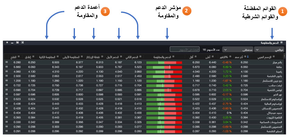 (1) تقوم هذه القائمة بعرض نقاط الدعم والمقاومة لقوائم الأسهم المفضلة والقوائم الشرطية والتى يتم إعدادها من شاشة الأسعار