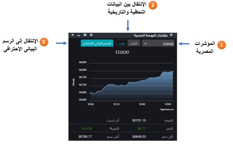 تحتوى على قائمة بيانات المؤشرات المصرية لحظياً ورسم بيانى توضيحى لمتابعة أداء المؤشرات بالإضافة إلى البيانات التاريخية والرسم البيانى التاريخى