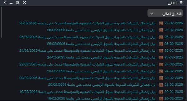 تحتوى على التقارير المالية اليومية والإسبوعية والشهرية والتقارير الغير دورية عن أداء الأسهم والسوق من البورصة المصرية بالإضافة إلى تقارير التحليل المالى والفنى