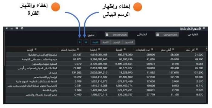 تقوم بعرض بيانات الاسهم الأكثر نشاطاً من حيث كمية التداول وقيمة التداول كما تقوم بعرض الرابحون والخاسرون فى فترة محددة من اختيار المستخدم بحد أقصى 5 سنوات مضت